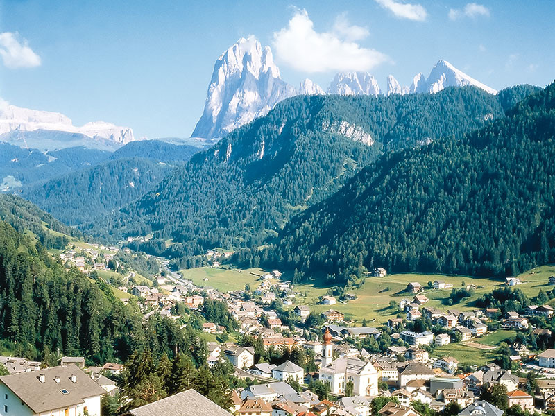 Si comincia dalla Val Gardena, conosciuta universalmente per le competizioni di sci a livello internazionale e la scultura del legno, che qui vanta una tradizione secolare. Pausa ad Ortisei, capoluogo della valle e possibilità di visita ai numerosi atelier e negozi di sculture. Le piste di sci, fra le più belle e conosciute delle Alpi, sono visitate tutti gli anni da decine di migliaia di appassionati degli sport invernali. Si prosegue verso il Gruppo del Sella, di cui conosceremo tre dei quattro passi che lo racchiudono: Sella, Pordoi e Campolongo. Qui si ammirano le quattro vallate dove si parla ancora una lingua molto antica che discende direttamente dal latino: il "ladino" dolomitico, parlato da circa 30.000 persone che vivono ai piedi di questo gigante di pietra che appare come un'immensa fortezza. E' bizzarro poter leggere i nomi di villaggi e località nelle tre lingue ufficiali della regione: italiano, tedesco e ladino! Si passa da Arabba per giungere in Val Badia, altra zona famosa per lo sci. Corvara è dominata dalle torri del Sassonghèr, quasi un baluardo che annuncia l'affilata catena del Cir. La piccola cappella di Santa Tarina, nel piccolo cimitero del villaggio, racchiude uno dei più begli altari a portelle della zona alpina. Si scende, attraverso un paesaggio dominato da foreste, prati verdeggianti e costellato di castelli e villaggi fortificati, verso S. Lorenzo di Sebato, antica mansio romana a pochi km dalla città di Brunico.
